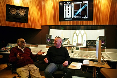 The owner of Pilot Recording Studio chats with a jazz legend in the control room.