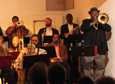 Aaron Johnson, far right, plays with the Oliver Lake Big Band at Jazz Gallery in New York City.