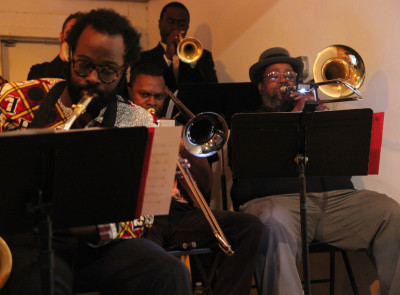 Aaron Johnson, right, plays at Jazz Gallery in New York City with the Oliver Lake Big Band.